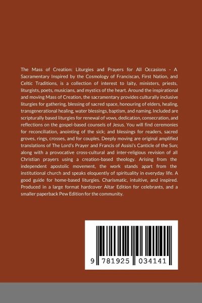 The Mass of Creation: Liturgies and Prayers for All Occasions - A Sacramentary Inspired by the Cosmology of Franciscan, First Nation, and Celtic Traditions, is a collection of interest to laity, ministers, priests, liturgists, poets, musicians, and mystics of the heart. Around the inspirational and moving Mass of Creation, the sacramentary provides culturally inclusive liturgies for gathering, blessing of sacred space, honouring of elders, healing, transgenerational healing, water blessings, baptism, and naming. Included are scripturally based liturgies for renewal of vows, dedication, consecration, and reflections on the gospel-based counsels of Jesus. You will find ceremonies for reconciliation, anointing of the sick; and blessings for readers, sacred groves, rings, crosses, and for couples. Deeply moving are original amplified translations of The Lord's Prayer and Francis of Assisi's Canticle of the Sun; along with a provocative cross-cultural and inter-religious revision of all Christian prayers using a creation-based theology. Arising from the independent apostolic movement, the work stands apart from the institutional church and speaks eloquently of spirituality in everyday life. A good guide for home-based liturgies. Charismatic, intuitive, and inspired. Produced in a large format hardcover Altar Edition for celebrants, and a smaller paperback Pew Edition for the community.