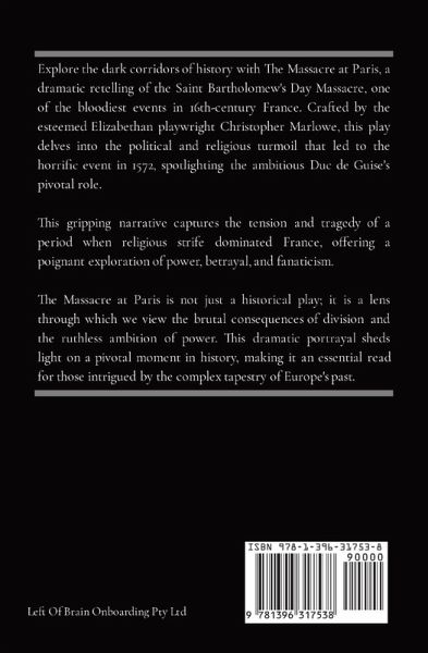 Explore the dark corridors of history with The Massacre at Paris, a dramatic retelling of the Saint Bartholomew's Day Massacre, one of the bloodiest events in 16th-century France. Crafted by the esteemed Elizabethan playwright Christopher Marlowe, this play delves into the political and religious turmoil that led to the horrific event in 1572, spotlighting the ambitious Duc de Guise's pivotal role. This gripping narrative captures the tension and tragedy of a period when religious strife dominated France, offering a poignant exploration of power, betrayal, and fanaticism. The Massacre at Paris is not just a historical play; it is a lens through which we view the brutal consequences of division and the ruthless ambition of power. This dramatic portrayal sheds light on a pivotal moment in history, making it an essential read for those intrigued by the complex tapestry of Europe's past.