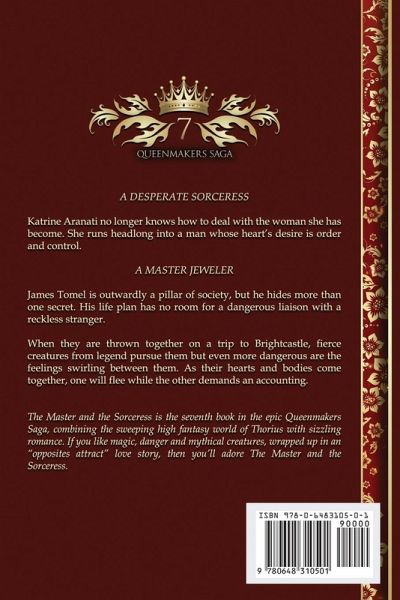 A desperate sorceress Katrine Aranati no longer knows how to deal with the woman she has become. She runs headlong into a man whose heart's desire is order and control. A master jeweler James Tomel is outwardly a pillar of society, but he hides more than one secret. His life plan has no room for a dangerous liaison with a reckless stranger. When they are thrown together on a trip to Brightcastle, fierce creatures from legend pursue them but even more dangerous are the feelings swirling between them. As their hearts and bodies come together, one will flee while the other demands an accounting. The Master and the Sorceress is the seventh book in the epic Queenmakers Saga, combining the sweeping high fantasy world of Thorius with sizzling romance. If you like magic, danger and mythical creatures, wrapped up in an "opposites attract" love story, then you'll adore The Master and the Sorceress. This book contains sex scenes and is intended for mature readers.