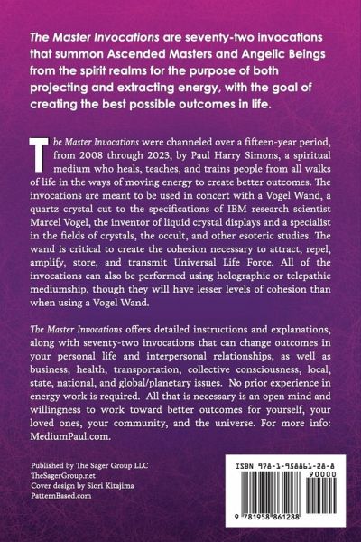 The Master Invocations are seventy-two invocations that summon Ascended Masters and Angelic Beings from the spirit realms for the purpose of both projecting and extracting energy, with the goal of creating the best possible outcomes in life. The Master Invocations were channeled over a fifteen-year period, from 2008 through 2023, by Paul Harry Simons, a spiritual medium who heals, teaches, and trains people from all walks of life in the ways of moving energy to create better outcomes. The invocations are meant to be used in concert with a Vogel Wand, a quartz crystal cut to the specifications of IBM research scientist Marcel Vogel, the inventor of liquid crystal displays and a specialist in the fields of crystals, the occult, and other esoteric studies. The wand is critical to create the cohesion necessary to attract, repel, amplify, store, and transmit Universal Life Force. All of the invocations can also be performed using holographic or telepathic mediumship, though they will have lesser levels of cohesion than when using a Vogel Wand. The Master Invocations offers detailed instructions and explanations, along with seventy-two invocations that can change outcomes in your personal life and interpersonal relationships, as well as business, health, transportation, collective consciousness, local, state, national, and global/planetary issues. No prior experience in energy work is required. All that is necessary is an open mind and willingness to work toward better outcomes for yourself, your loved ones, your community, and the universe.