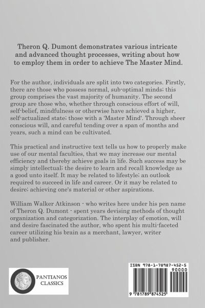 Theron Q. Dumont demonstrates various intricate and advanced thought processes, writing about how to employ them in order to achieve The Master Mind. For the author, individuals are split into two categories. Firstly, there are those who possess normal, sub-optimal minds; this group comprises the vast majority of humanity. The second group are those who, whether through conscious effort of will, self-belief, mindfulness or otherwise have achieved a higher, self-actualized state; those with a 'Master Mind'. Through sheer conscious will, and careful tending over a span of months and years, such a mind can be cultivated. This practical and instructive text tells us how to properly make use of our mental faculties, that we may increase our mental efficiency and thereby achieve goals in life. Such success may be simply intellectual; the desire to learn and recall knowledge as a good unto itself. It may be related to lifestyle; an outlook required to succeed in life and career. Or it may be related to desire; achieving one's material or other aspirations. William Walker Atkinson - who writes here under his pen name of Theron Q. Dumont - spent years devising methods of thought organization and categorization. The interplay of emotion, will and desire fascinated the author, who spent his multi-faceted career utilizing his brain as a merchant, lawyer, writer and publisher.