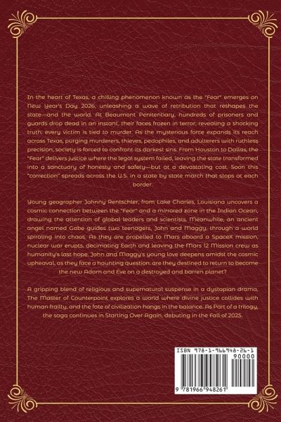 In the heart of Texas, an unexplainable force known only as the Fear descends on Beaumont Penitentiary-instantly killing hundreds of prisoners and guards with a single terrifying stroke. Their shared fate? Each was tied to a murder. As the phenomenon spreads across the state, it targets criminals overlooked by the legal system-murderers, thieves, pedophiles, even adulterers-striking them down with chilling precision. From Houston to Dallas, Texas transforms into a sanctuary of truth and safety-but the cost is staggering. Young geographer Johnny Rentschter discovers a mysterious cosmic connection to a mirrored zone in the Indian Ocean, drawing global scrutiny. Meanwhile, an ancient angel named Gabe guides two teenagers, John and Maggy, through the unraveling world, offering hope as chaos spreads. With Earth spiraling into nuclear devastation, John and Maggy are launched to Mars aboard the SpaceX Mars 12 mission-humanity's last chance for survival. As love blossoms in the shadows of extinction, they face an impossible question: are they the new Adam and Eve, destined to rebuild humanity from the ashes? The Master of Counterpoint is a gripping blend of dystopian suspense, religious mythology, and cosmic mystery-perfect for fans of The Stand, The Left Behind Series, and The Silent Corner. This is the first book in a trilogy, continuing with Starting Over Again, coming Fall 2025.