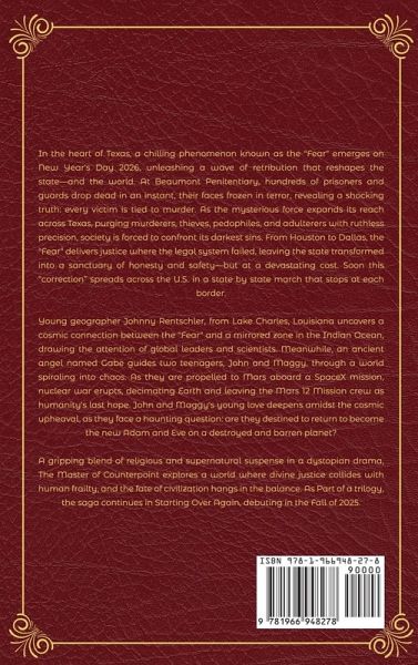 In the heart of Texas, an unexplainable force known only as the Fear descends on Beaumont Penitentiary-instantly killing hundreds of prisoners and guards with a single terrifying stroke. Their shared fate? Each was tied to a murder. As the phenomenon spreads across the state, it targets criminals overlooked by the legal system-murderers, thieves, pedophiles, even adulterers-striking them down with chilling precision. From Houston to Dallas, Texas transforms into a sanctuary of truth and safety-but the cost is staggering. Young geographer Johnny Rentschter discovers a mysterious cosmic connection to a mirrored zone in the Indian Ocean, drawing global scrutiny. Meanwhile, an ancient angel named Gabe guides two teenagers, John and Maggy, through the unraveling world, offering hope as chaos spreads. With Earth spiraling into nuclear devastation, John and Maggy are launched to Mars aboard the SpaceX Mars 12 mission-humanity's last chance for survival. As love blossoms in the shadows of extinction, they face an impossible question: are they the new Adam and Eve, destined to rebuild humanity from the ashes? The Master of Counterpoint is a gripping blend of dystopian suspense, religious mythology, and cosmic mystery-perfect for fans of The Stand, The Left Behind Series, and The Silent Corner. This is the first book in a trilogy, continuing with Starting Over Again, coming Fall 2025.