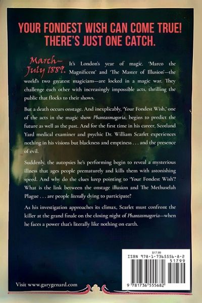 Your fondest wish can come true! There's just one catch. London, 1889. It's London's year of magic. 'Marco the Magnificent' and 'The Master of Illusion'-the world's two greatest magicians-are locked in a magic war. They challenge each other with increasingly impossible acts, thrilling the public that flocks to their shows. But a death occurs onstage. And inexplicably, 'Your Fondest Wish,' one of the acts in the magic show Phantasmagoria, begins to predict the future as well as the past! And for the first time in his career, Scotland Yard medical examiner and psychic Dr. William Scarlet experiences nothing in his visions but blackness and emptiness . . . and the presence of evil. Suddenly, the autopsies he's performing begin to reveal a mysterious illness that ages people prematurely and kills them with astonishing speed. And why do the clues keep pointing to 'Your Fondest Wish'? What is the link between the onstage illusion and The Methuselah Plague . . . are people literally dying to participate? As his investigation approaches its climax, Scarlet must confront the killer at the grand finale on the closing night of Phantasmagoria-when he faces a power that's literally like nothing on earth.
