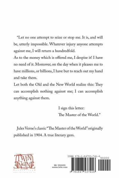 "Let no one attempt to seize or stop me. It is, and will be, utterly impossible. Whatever injury anyone attempts against me, I will return a hundredfold.As to the money which is offered me, I despise it! I have no need of it. Moreover, on the day when it pleases me to have millions, or billions, I have but to reach out my hand and take them. Let both the Old and the New World realize this: They can accomplish nothing against me; I can accomplish anything against them. I sign this letter: The Master of the World." Jules Verne's classic "The Master of the World" originally published in 1904. A true literary gem.