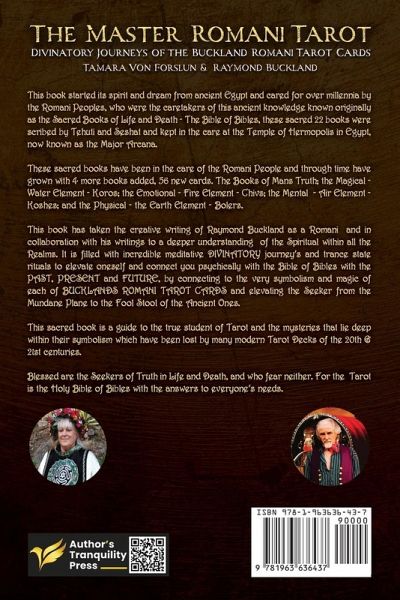 This book started its spirit and dream from ancient Egypt and cared for over millennia by the Romani Peoples, who were the caretakers of this ancient knowledge known originally as the Sacred Books of Life and Death - The Bible of Bibles, these sacred 22 books were scribed by Tehuti and Seshat and kept in the care at the Temple of Hermopolis in Egypt, now known as the Major Arcana. These sacred books have been in the care of the Romani People and through time have grown with 4 more books added, 56 new cards. The Books of Mans Truth; the Magical - Water Element - Koros; the Emotional - Fire Element - Chivs; the Mental - Air Element - Koshes; and the Physical - the Earth Element - Bolers. This book has taken the creative writing of Raymond Buckland as a Romani and in collaboration with his writings to a deeper understanding of the Spiritual within all the Realms. It is filled with incredible meditative DIVINATORY journey's and trance state rituals to elevate oneself and connect you psychically with the Bible of Bibles with the PAST, PRESENT and FUTURE, by connecting to the very symbolism and magic of each of BUCKLANDS ROMANI TAROT CARDS and elevating the Seeker from the Mundane Plane to the Fool Stool of the Ancient Ones. This sacred book is a guide to the true student of Tarot and the mysteries that lie deep within their symbolism which have been lost by many modern Tarot Decks of the 20th & 21st centuries. Blessed are the Seekers of Truth in Life and Death, and who fear neither. For the Tarot is the Holy Bible of Bibles with the answers to everyone's needs.
