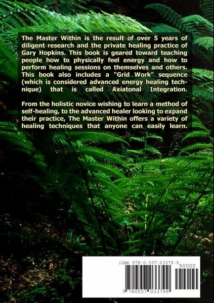 The Master Within is the result of over 5 years of diligent research and the private healing practice of Gary Hopkins. This book is geared toward teaching people how to physically feel energy and how to perform healing sessions on themselves and others. This book also includes a "Grid Work" sequence (which is considered advanced energy healing technique) that is called Axiatonal Integration.