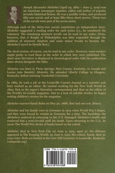 Joseph Alexander Altsheler (April 29, 1862 - June 5, 1919) was an American newspaper reporter, editor and author of popular juvenile historical fiction. He was a prolific writer, and produced fifty-one novels and at least fifty-three short stories. Thirty-two of his novels were part of his seven series. Although each of the thirty-two novels constitutes an independent story, Altsheler suggested a reading order for each series (i.e., he numbered the volumes). The remaining nineteen novels can be read in any order. [Note, however, that A Knight of Philadelphia was later expanded through the addition of nineteen chapters and some minor tweaks to become Mr. Altsheler's novel In Hostile Red.] The short stories, of course, can be read in any order. However, some readers might prefer to read them in the order in which they were published. The short story list below is displayed in chronological order with the publication dates shown alongside the titles. Altsheler was born in Three Springs, Hart County, Kentucky, to Joseph and Louise (née Snoddy) Altsheler. He attended Liberty College in Glasgow, Kentucky, before entering Vanderbilt University. In 1885, he took a job at the Louisville Courier-Journal as a reporter and later worked as an editor. He started working for the New York World in 1892, first as the paper's Hawaiian correspondent and then as the editor of the World's tri-weekly magazine. Due to a lack of suitable stories, he began writing children's stories for the magazine. Altsheler married Sarah Boles on May 30, 1888; they had one son, Sidney. Altsheler and his family were in Germany in 1914 when World War I began, and they were forced to remain in Germany for a time. The hardships the Altshelers endured in returning to the U.S. damaged Altsheler's health and rendered him a semi-invalid until his death. Upon returning to the U.S., he wrote The World War Series of books based on his ordeal. Altsheler died in New York City on June 5, 1919, aged 57; his obituary appeared in The Evening World, on June 6, 1919. His widow, Sarah, died 30 years later. Both are buried at the Cave Hill Cemetery in Louisville, Kentucky. (wikipedia.org)