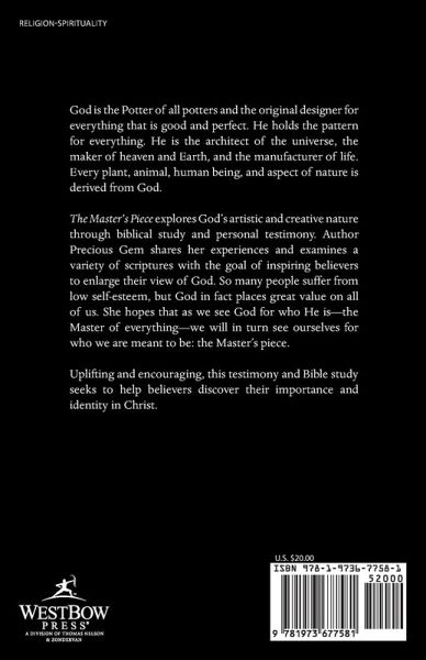 God is the Potter of all potters and the original designer for everything that is good and perfect. He holds the pattern for everything. He is the architect of the universe, the maker of heaven and Earth, and the manufacturer of life. Every plant, animal, human being, and aspect of nature is derived from God. The Master's Piece explores God's artistic and creative nature through biblical study and personal testimony. Author Precious Gem shares her experiences and examines a variety of scriptures with the goal of inspiring believers to enlarge their view of God. So many people suffer from low self-esteem, but God in fact places great value on all of us. She hopes that as we see God for who He is-the Master of everything-we will in turn see ourselves for who we are meant to be: the Master's piece. Uplifting and encouraging, this testimony and Bible study seeks to help believers discover their importance and identity in Christ.