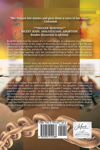"She forgave her storms and gave them a voice in her story." - Unknown **TRIGGER WARNING** INCEST. RAPE. MOLESTATION. ABORTION. Reader discretion is advised. Read the story from the source of a 15-year-old girl, in a desperate search to locate her biological father. In her stages of discovery, Sylvia dug up a part of her life that almost led to her demise. Out of the shadows, appeared a world full of perversion, incest, concubines, lies, and deceit. The life-altering reality resulted in Sylvia being in a 7-year legal marriage with her newfound biological father. Did she lose her faith? What was the threshold of pain Sylvia weathered through before planning her escape? "When I heard Sylvia's story, my mind was blown. It honestly took me a while to process even the synopsis version of her full story that we've come to know now. I remember thinking, "You need to write a book!" I can't express how proud I am of Sylvia for publishing her story, in her voice before anyone else can. I say this because the world would've known Sylvia whether she wanted them to or not." - Close Friend A book was written long before I wrote it. Seven years through hell, seven years to write this book, and an additional three years for my daughter, Ceaphrael, to transform my experience, into a story even I couldn't imagine. Simply writing this exert for you now, is surreal. As the ink dried on each paper, I began preparing for the world to hear one of the craziest stories heard, my story. I've arrived at a place of peace knowing how many women will gain strength and courage because of mine. Words housed in this book are the most vulnerable pieces of my heart to your eyes. I pray you find forgiveness for every fault towards you at the hand of others. Most of all, my prayer is for you to consciously decide to bathe in healing every day. - Sylvia L. Benson