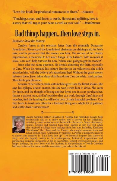 Caralyn fumes at the rejection letter from the reputable Doncaster Foundation. She rescued the foundation's chairman on a hiking trail, for Pete's sake, and he promised that the money was hers. The success of her charity organization, a memorial to her sister, hangs in the balance. With so much at stake, Cara can't help but wonder now, "where am I going to get the money?" Jason asks that same question. He dreads admitting the theft, especially to Cara. When he revealed his seizure disorder in the wilderness, she didn't abandon him. Will she believe he's abandoned her? Without the grant money between them, Jason takes a leap of faith and asks Cara on a date...and another. Then his hopes plummet. Because of her sister's crash, automobiles give Cara the literal shakes. She says his epilepsy doesn't matter, but she won't trust him to drive. She cares for Jason, and the thought of losing another loved one in a car paralyzes her. Jason's a patient man, and he's positive they can work through Cara's fear and together, find the funding that will solve both of their financial problems. Can they learn to trust each other for a lifetime? Bring on a whole lot of patience and a little divine intervention!