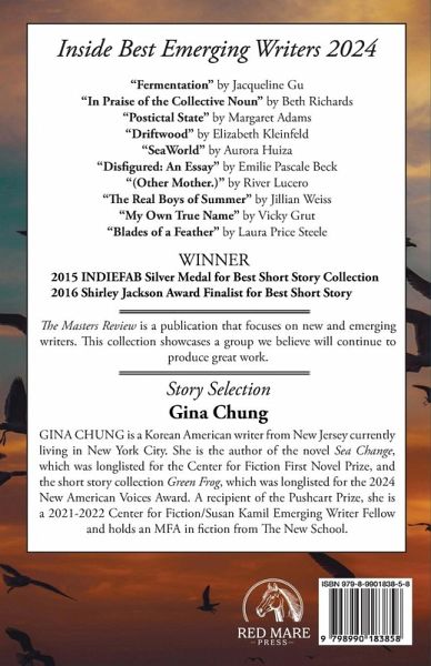The Masters Review's Best Emerging Writers 2024 features ten short stories and essays from promising writers around the world, selected by guest judge Gina Chung. "These stories ask questions about power, intimacy, control, our imperfect knowledge of one another and the world around us," Chung writes in her introduction. "There is heartbreak and suffering here, as well as healing, of a kind." Take a chance on these emerging masters of craft, and we promise you'll be surprised. Featured in this anthology: Jacqueline Gu ¿ Beth Richards ¿ Margaret Adams ¿ Elizabeth Kleinfeld ¿ Aurora Huiza ¿ Emilie Pascale Beck ¿ River Lucero ¿ Jillian Weiss ¿ Vicky Grut ¿ Laura Price Steele