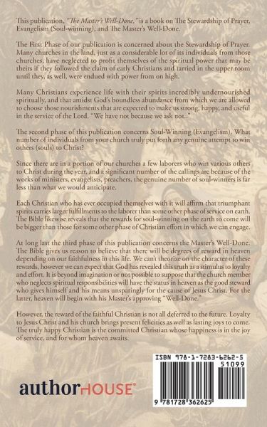 This publication, "The Master's Well-Done," is a book on The Stewardship of Prayer, Evangelism (Soul-winning), and The Master's Well-Done. The First Phase of our publication is concerned about the Stewardship of Prayer. Many churches in the land, just as a considerable lot of its individuals from those churches, have neglected to profit themselves of the spiritual power that may be theirs if they followed the claim of early Christians and tarried in the upper room until they, as well, were endued with power from on high. Many Christians experience life with their spirits incredibly undernourished spiritually, and that amidst God's boundless abundance from which we are allowed to choose those nourishments that are expected to make us strong, happy, and useful in the service of the Lord. "We have not because we ask not.." The second phase of this publication concerns Soul-Winning (Evangelism). What number of individuals from your church truly put forth any genuine attempt to win others (souls) to Christ? Since there are in a portion of our churches a few laborers who win various others to Christ during the year, and a significant number of the callings are because of the works of ministers, evangelists, preachers, the genuine number of soul-winners is far less than what we would anticipate. Each Christian who has ever occupied themselves with it will affirm that triumphant spirits carries larger fulfillments to the laborer than some other phase of service on earth. The Bible likewise reveals that the rewards for soul-winning on the earth to come will be bigger than those for some other phase of Christian effort in which we can engage. At long last the third phase of this publication concerns the Master's Well-Done. The Bible gives us reason to believe that there will be degrees of reward in heaven depending on our faithfulness in this life. We can't theorize on the character of these rewards, however we can expect that God has revealed this truth as a stimulus to loyalty and effort. It is beyond imagination or not possible to suppose that the church member who neglects spiritual responsibilities will have the status in heaven as the good steward who gives himself and his means unsparingly for the cause of Jesus Christ. For the latter, heaven will begin with his Master's approving "Well-Done." However, the reward of the faithful Christian is not all deferred to the future. Loyalty to Jesus Christ and his church brings present felicities as well as lasting joys to come. The truly happy Christian is the committed Christian whose happiness is in the joy of service, and for whom heaven awaits.