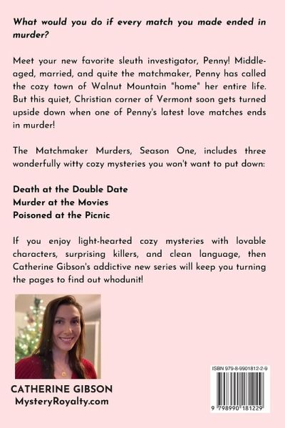 What would you do if every match you made ended in murder? Meet your new favorite sleuth investigator, Penny! Middle-aged, married, and quite the matchmaker, Penny has called the cozy town of Walnut Mountain "home" her entire life. But this quiet, Christian corner of Vermont soon gets turned upside down when one of Penny's latest love matches ends in murder! The Matchmaker Murders, Season One, includes three wonderfully witty cozy mysteries you won't want to put down: Death at the Double DateMurder at the MoviesPoisoned at the Picnic If you enjoy light-hearted cozy mysteries with lovable characters, surprising killers, and clean language, then Catherine Gibson's addictive new series will keep you turning the pages to find out whodunit!