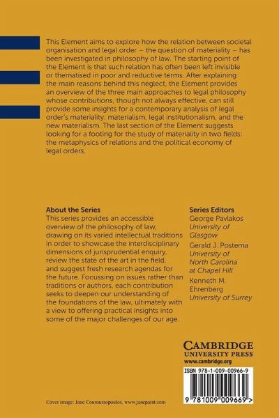 This Element aims to explore how the relation between societal organisation and legal orders ¿ the question of materiality ¿ has been investigated in philosophy of law. The starting point of the Element is that such relation has often been left invisible or thematised in poor and reductive terms. After having explained the main reasons behind this neglect, the Element provides an overview of the three main approaches to legal philosophy whose contributions, though not always effective, can still provide some insights for a contemporary analysis of legal orders' materiality: materialism, legal institutionalism, and the new materialism. The last section of the Element suggests looking for a footing for the study of materiality in two fields: the metaphysics of relations and the political economy of legal orders.
