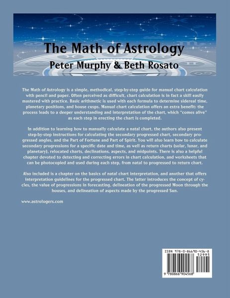 The Math of Astrology is a simple, methodical, step-by-step guide for manual chart calculation with pencil and paper. Often perceived as difficult, chart calculation is in fact a skill easily mastered with practice. Basic arithmetic is used with each formula to determine sidereal time, planetary positions, and house cusps. Manual chart calculation offers an extra benefit: the process leads to a deeper understanding and interpretation of the chart, which "comes alive" as each step in erecting the chart is completed. In addition to learning how to manually calculate a natal chart, the authors also present step-by-step instructions for calculating the secondary progressed chart, secondary progressed angles, and the Part of Fortune and Part of Spirit. You will also learn how to calculate secondary progressions for a specific date and time, as well as return charts (solar, lunar, and planetary), relocated charts, declinations, aspects, and midpoints. There is also a helpful chapter devoted to detecting and correcting errors in chart calculation, and worksheets that can be photocopied and used during each step, from natal to progressed to return chart. Also included is a chapter on the basics of natal chart interpretation, and another that offers interpretation guidelines for the progressed chart. The latter introduces the concept of cycles, the value of progressions in forecasting, delineation of the progressed Moon through the houses, and delineation of aspects made by the progressed Sun.
