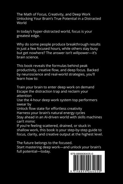 The Math of Focus, Creativity, and Deep Work Unlocking Your Brain's True Potential in a Distracted World In an age of constant digital noise, the ability to focus is no longer optional-it's your greatest competitive advantage. Why do some people achieve exceptional results in just a few focused hours, while others remain overwhelmed and unproductive despite being busy all day? The answer isn't just willpower-it's the science of how your brain works best. The Math of Focus, Creativity, and Deep Work uncovers the hidden formulas behind deep focus, creative flow, and peak productivity. Drawing on neuroscience, cognitive psychology, and high-performance systems, this practical guide will show you how to: 1. Train your brain to access deep work states on demand 2. Escape the distraction trap and take control of your attention 3. Tap into flow-the effortless zone where creativity and clarity thrive 4. Use the 4-hour deep work method used by top performers 5. Align your work with your natural energy cycles to prevent burnout 6. Thrive in an AI-driven world by developing the kind of thinking machines can't replicate If you feel scattered, drained, or stuck in shallow work, this book offers a step-by-step blueprint to help you reclaim your mind, elevate your output, and create work that truly matters. Your best work starts with your best focus. Start mastering deep work-and unlock your full potential-today.