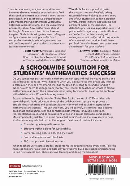 A schoolwide solution for mathematics success! When "rules" seem to change from year to year, mathematics can seem like a disconnected mystery for students. Clear up the confusion with a Mathematics Whole-School Agreement! Expanded from the highly popular "Rules that Expire" series of NCTM articles, this essential guide leads educators through the collaborative step-by-step process of establishing a coherent and consistent learner-centered and equitable approach to mathematics instruction. You’ll learn to avoid "rules that expire"—tricks that may seem to help students in one grade but hurt in the long run. Features include · Abundant grade-specific examples · Effective working plans for sustainability · Barrier-busting tips, to-dos, and try-it-outs · PLC prompts and discussion points
