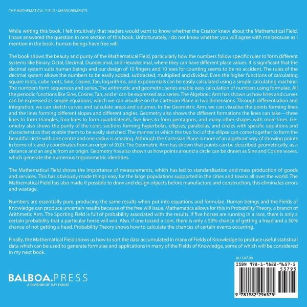 While writing this book, I felt intuitively that readers would want to know whether the Creator knew about the Mathematical Field. I have answered the question in one section of this book. Unfortunately, I do not know whether you will agree with me because as I mention in the book, human beings have free will. The book shows the beauty and purity of the Mathematical Field, particularly how the numbers follow specific rules to form different systems like Binary, Octal, Decimal, Duodecimal, and Hexadecimal, where they can have different place values. It is significant that the decimal system suits human beings and our design of 10 fingers and 10 toes for counting seems to be no accident. The rules of the decimal system allows the numbers to be easily added, subtracted, multiplied and divided. Even the higher functions of calculating square roots, cube roots, Sine, Cosine, Tan, logarithms, and exponentials can be easily calculated using a simple calculating machine. The numbers form sequences and series. The arithmetic and geometric series enable easy calculation of numbers using formulae. All the periodic functions like Sine, Cosine, Tan, and ex can be expressed as a series. The Algebraic Arm has shown us how lines and curves can be expressed as simple equations, which we can visualise on the Cartesian Plane in two dimensions. Through differentiation and integration, we can sketch curves and calculate areas and volumes. In the Geometric Arm, we can visualise the points forming lines and the lines forming different slopes and different angles. Geometry also shows the different formations the lines can take-three lines to form triangles, four lines to form quadrilaterals, five lines to form pentagons, and many other shapes with more lines. Geometry also shows the purity of the conic sections forming hyperbolas, ellipses, parabolas, and circles with specific equations and characteristics that enable them to be easily sketched. The manner in which the two foci of the ellipse can come together to form the beautiful circle with one centre and one radius is amazing. Although the Cartesian Plane is more of an algebraic way of showing points in terms of x and y coordinates from an origin of (0,0), the Geometric Arm has shown that points can be described geometrically, as a distance and an angle from an origin. Geometry has also shown us how points around a circle can be drawn as Sine and Cosine waves, which generate the numerous trigonometric identities. The Mathematical Field shows the importance of measurements, which has led to standardisation and mass production of goods and services. This has obviously made things easy for the large populations supported in the cities and towns all over the world. The Mathematical Field has also made it possible to draw and design objects before manufacture and construction; this eliminates errors and wastage. Numbers are essentially pure producing the same results when put in equations and formulae. Human beings and the Fields of Knowledge can produce uncertain results because of the free will issue. Mathematics allows for this in Probability Theory, a branch of Arithmetic Arm. The Sporting Field is full of probability associated with the results. If five horses are running in a race, there is only a certain probability that a particular horse will win. Also, if one tossed a coin, there is only a 50% chance of getting a head and a 50% chance of not getting a head. Probability Theory shows how to calculate the chances of certain events occurring. Finally, the Mathematical Field shows us how to sort the data accumulated in many of Fields of Knowledge to produce useful statistical data and generate formulae and applications in many other Fields of Knowledge, some of which will be considered in my next book.