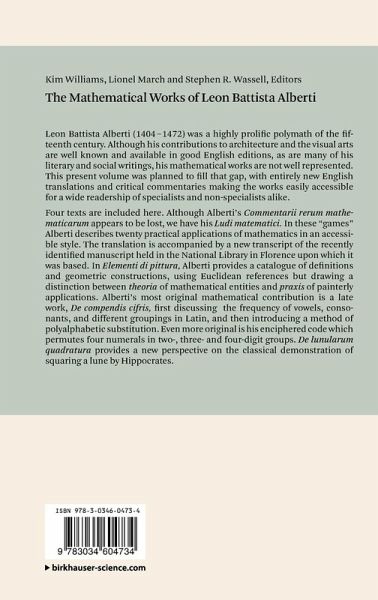 Leon Battista Alberti was an outstanding polymath of the fifteenth century, alongside Piero della Francesca and before Leonardo da Vinci. While his contributions to architecture and the visual arts are well known and available in good English editions, and much of his literary and social writings are also available in English, his mathematical works are not well represented in readily available, accessible English editions have remained accessible only to specialists. The four treatises included here - Ludi matematici, De Componendis Cifris, Elementi di pittura and De lunularum quadratura - are extremely valuable in rounding out the portrait of this multitalented thinker. The treatises are presented in modern English translations, with commentary that is intended to make evident the depths of Alberti's knowledge as well as address the treatises' mathematical, historical and cultural context, their classical Greek roots, and their relationship to later works by Renaissance thinkers.