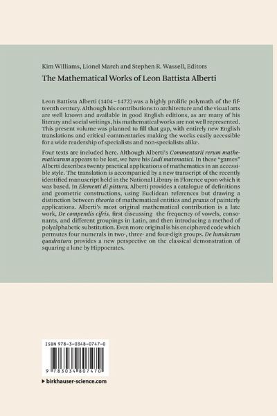 Leon Battista Alberti was an outstanding polymath of the fifteenth century, alongside Piero della Francesca and before Leonardo da Vinci. While his contributions to architecture and the visual arts are well known and available in good English editions, and much of his literary and social writings are also available in English, his mathematical works are not well represented in readily available, accessible English editions have remained accessible only to specialists. The four treatises included here - Ludi matematici, De Componendis Cifris, Elementi di pittura and De lunularum quadratura - are extremely valuable in rounding out the portrait of this multitalented thinker. The treatises are presented in modern English translations, with commentary that is intended to make evident the depths of Alberti's knowledge as well as address the treatises' mathematical, historical and cultural context, their classical Greek roots, and their relationship to later works by Renaissance thinkers.