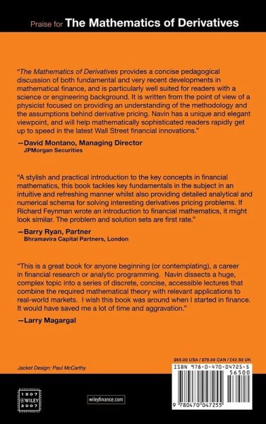 Praise for 'The Mathematics of Derivatives': "'The Mathematics of Derivatives' provides a concise pedagogical discussion of both fundamental and very recent developments in mathematical finance, and is particularly well suited for readers with a science or engineering background. It is written from the point of view of a physicist focused on providing an understanding of the methodology and the assumptions behind derivative pricing. Navin has a unique and elegant viewpoint, and will help mathematically sophisticated readers rapidly get up to speed in the latest Wall Street financial innovations." (David Montano, Managing Director JPMorgan Securities)