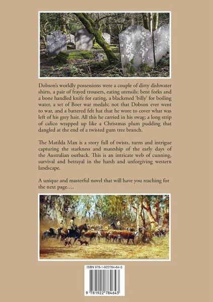Dobson's worldly possessions were a couple of dirty dishwater shirts, a pair of frayed trousers, eating utensil; bent forks and a bone handled knife for eating, a blackened 'billy' for boiling water, a set of Boer war medals; not that Dobson ever went to war, and a battered felt hat that he wore to cover what was left of his grey hair. All this he carried in his swag; a long strip of calico wrapped up like a Christmas plum pudding that dangled at the end of a twisted gum tree branch. The Matilda Man is a story full of twists, turns and intrigue, capturing the starkness and mateship of the early days of the Australian outback. This is an intricate web of cunning, survival, and betrayal in the harsh and unforgiving western landscape. A unique and masterful novel that will have you reaching for the next page...