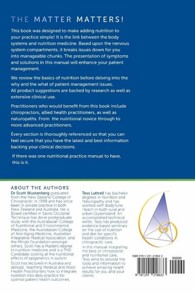 Written for practitioners by practitioners, this book was designed to make adding nutrition to your practice simple! It is the link between the body systems and nutrition medicine. Based upon the nervous system compartments, it breaks issues down for you into manageable chunks. We review the basics of nutrition before delving into the why and the what of patient management issues. Practitioners who would benefit from this book include chiropractors, allied health practitioners, as well as naturopaths. Every section is thoroughly referenced so that you can feel secure that you have the latest and best information backing your clinical decisions. If there was one nutritional practice manual to have this is it.