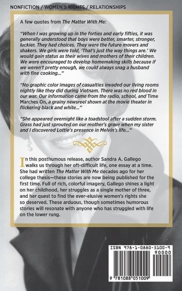 In this posthumous release, author Sandra A. Gallego walks us through her oft-difficult life, one essay at a time. She had written The Matter With Me decades ago for her college thesis-these stories are now being published for the first time. Full of rich, colorful imagery, Gallego shines a light on her childhood, her struggles as a single mother of three, and her quest to find the ever-elusive women's rights she so deserved. These arduous, though sometimes humorous stories will resonate with anyone who has struggled with life on the lower rung.