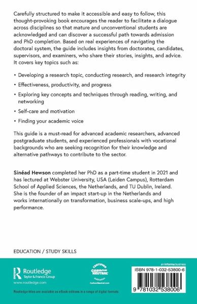 Carefully structured to make it accessible and easy to follow, this thought-provoking book encourages the reader to facilitate a dialogue across disciplines so that mature and unconventional students are acknowledged and can discover a successful path towards admission and PhD completion. Based on real experiences of navigating the doctoral system, the guide includes insights from doctorates, candidates, supervisors, and examiners, who share their stories, insights, and advice. It covers key topics such as: