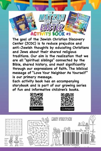 The Matzah That Saved Easter: Activity Book #1 has an accompanying storybook and is part of our growing series of fun and informative children's books. It is a companion to The Matzah That Saved Easter storybook. Each activity book contains coloring pages featuring the original story, a maze, word find, and fun writing activities that encourage young readers to be a part of the story and expand upon the lessons of helping, similarities, and fellowship. The Matzah That Saved Easter introduces readers to Joey and Kristie. They're two young neighbors from different religious backgrounds. With the help of Rabbi Abraham and Reverend Jamie, Joey shares some of his Jewish traditions and history with Kristie who is a Christian. The Matzah That Saved Easter: Activity Book #1 is activity book number 2 of an upcoming series of books featuring more of Kristie and Joey's adventures. Please check out all of the storybooks and each accompanying activity book. The goal of the Jewish Christian Discovery Center (JCDC) is simple: To reduce prejudice and anti-Jewish thoughts by educating Christians and Jews about their shared religious traditions. Our aim is the realization that we are all "spiritual siblings" connected by the Bible, shared history, and most significantly through our expressions of faith. The biblical message of "Love Your Neighbor As Yourself" is our primary message.