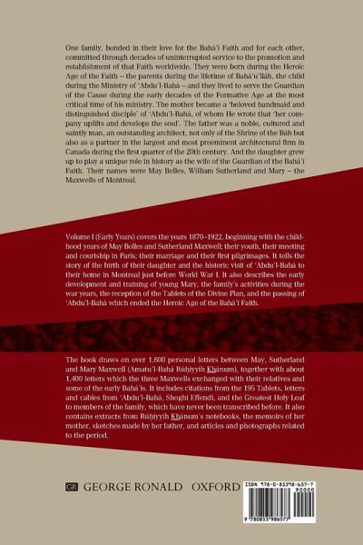 Vol 1 - Early Years 1870-1922 Beginning with their childhood years, this is the story of May Bolles and Sutherland Maxwell; their youth, their meeting and courtship in Paris; their marriage;their first pilgrimages; the birth of their daughter and the historic visit of 'Abdu'l-Bahá to their home in Montreal in 1912. One family, bonded in their love for the Bahá'í Faith and for each other, committed through decades of uninterrupted service to the promotion and establishment of that Faith worldwide. They were born during the Heroic Age of the Faith the parents during the lifetime of Bahá'u'lláh, the child during the Ministry of Abdu'l-Bahá and they lived to serve the Guardian of the Cause during the early decades of the Formative Age at the most critical time of his ministry. The mother became a beloved handmaid and distinguished disciple of Abdu'l-Bahá, of whom He wrote that her company uplifts and develops the soul. The father was a noble, cultured and saintly man, an outstanding architect, not only of the Shrine of the Báb but also as a partner in the largest and most preeminent architectural firm in Canada during the first quarter of the 20th century. And the daughter grew up to play a unique role in history as the wife of the Guardian of the Bahá'í Faith. Their names were May Bolles, William Sutherland and Mary the Maxwells of Montreal. Volume I (Early Years) covers the years 1870-1922, beginning with the childhood years of May Bolles and Sutherland Maxwell; their youth, their meeting and courtship in Paris; their marriage and their first pilgrimages. It tells the story of the birth of their daughter and the historic visit of 'Abdu'l-Bahá to their home in Montreal just before World War I. It also describes the early development and training of young Mary, the family's activities during the war years, the reception of the Tablets of the Divine Plan, and the passing of 'Abdu'l-Bahá which ended the Heroic Age of the Bahá'í Faith. The book draws on over 1,600 personal letters between May, Sutherland and Mary Maxwell (Amatu'l-Bahá Rúhíyyih Khánum), together with about 1,400 letters which the three Maxwells exchanged with their relatives and some of the early Bahá'ís. It includes citations from the 195 Tablets, letters and cables from 'Abdu'l-Bahá, Shoghi Effendi, and the Greatest Holy Leaf to members of the family, which have never been transcribed before. It also contains extracts from Rúhíyyih Khánum's notebooks, the memoirs of her mother, sketches made by her father, and articles and photographs related to the period.
