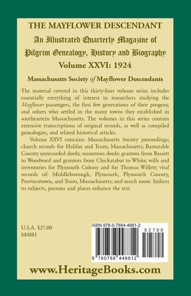 The material covered in this thirty-four volume series includes essentially everything of interest to researchers studying the Mayflower passengers, the first few generations of their progeny, and others who settled in the many towns they established in southeastern Massachusetts. The volumes in this series contain extensive transcriptions of original records, as well as compiled genealogies, and related historical articles. Volume XXVI contains: Massachusetts Society proceedings; church records for Halifax and Truro, Massachusetts; Barnstable County unrecorded deeds; numerous deeds: grantees from Bassett to Woodward and grantors from Chickatabut to White; wills and inventories for Plymouth Colony and for Thomas Willett; vital records of: Middleborough, Plymouth, Plymouth County, Provincetown, and Truro, Massachusetts; and much more. Indices to subjects, persons and places enhance the text.