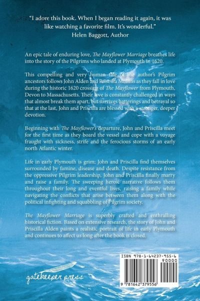 The Mayflower Marriage breathes life into the story of the Pilgrims who landed at Plymouth in 1620. This compelling and very human tale follows John Alden and Priscilla Mullins as they fall in love during the historic 1620 crossing of the Mayflower from Plymouth, England to Massachusetts. Their love is constantly challenged, but survives batterings and betrayals, and through this the couple achieve a stronger and deeper devotion. John and Priscilla meet in England as preparations for the Mayflower's departure are in progress, Priscilla as a passenger and John as a member of the crew. They gradually discover their mutual attraction as they cope with a voyage fraught with sickness, strife and ferocious storms. Life in early Plymouth is grim as the settlers suffer famine, disease and death. One after another, Priscilla loses her father, mother and younger brother. The comfort and support John longs to give her is limited by Pilgrim morality and strict social norms. Over time, conditions in the new colony gradually improve, with help from friendly Native Americans and occasional supply ships. Despite resistance from the Pilgrim leadership, John and Priscilla finally win through and marry. The sweeping, heroic narrative follows them throughout the remainder of their long and eventful lives, raising a family while navigating the political infighting and squabbling of early Pilgrim society.