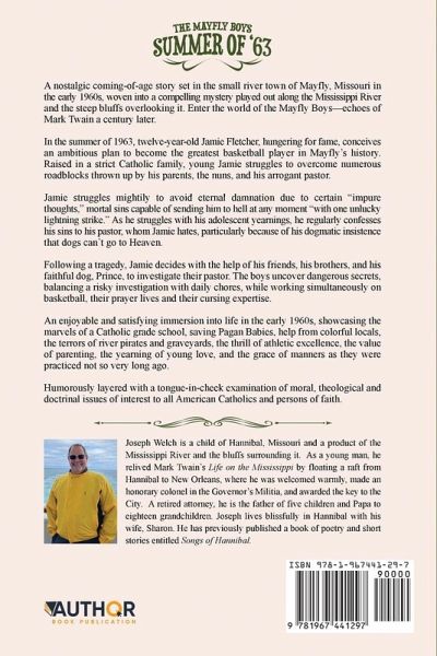 A nostalgic coming-of-age story set in the small river town of Mayfly, Missouri in the early 1960s, woven into a compelling mystery played out along the Mississippi River and the steep bluffs overlooking it. Enter the world of the Mayfly Boys-echoes of Mark Twain a century later. In the summer of 1963, twelve-year-old Jamie Fletcher, hungering for fame, conceives an ambitious plan to become the greatest basketball player in Mayfly's history. Raised in a strict Catholic family, young Jamie struggles to overcome numerous roadblocks thrown up by his parents, the nuns, and his arrogant pastor. Jamie struggles mightily to avoid eternal damnation due to certain "impure thoughts," mortal sins capable of sending him to hell at any moment "with one unlucky lightning strike." As he struggles with his adolescent yearnings, he regularly confesses his sins to his pastor, whom Jamie hates, particularly because of his dogmatic insistence that dogs can't go to Heaven. Following a tragedy, Jamie decides with the help of his friends, his brothers, and his faithful dog, Prince, to investigate their pastor. The boys uncover dangerous secrets, balancing a risky investigation with daily chores, while working simultaneously on basketball, their prayer lives and their cursing expertise. An enjoyable and satisfying immersion into life in the early 1960s, showcasing the marvels of a Catholic grade school, saving Pagan Babies, help from colorful locals, the terrors of river pirates and graveyards, the thrill of athletic excellence, the value of parenting, the yearning of young love, and the grace of manners as they were practiced not so very long ago. Humorously layered with a tongue-in-cheek examination of moral, theological and doctrinal issues of interest to all American Catholics and persons of faith.