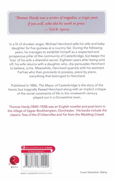Published in 1886, the protagonist, Michael Henchard, is a haytrusser who one day gets so drunk that he auctions off his wife and child for five guineas to a sailor. When sober, he realizes his mistake and vows not to touch liquor. Over the years, his hard work pays off, he becomes rich and eventually even the mayor of Casterbridge. Eighteen years after being sold off, his wife returns, with a daughter who, she persuades Henchard to believe, is his. Meanwhile, Henchard quarrels with his assistant Farfrae who then proceeds to possess, piece by piece, everything that belonged to Henchard.