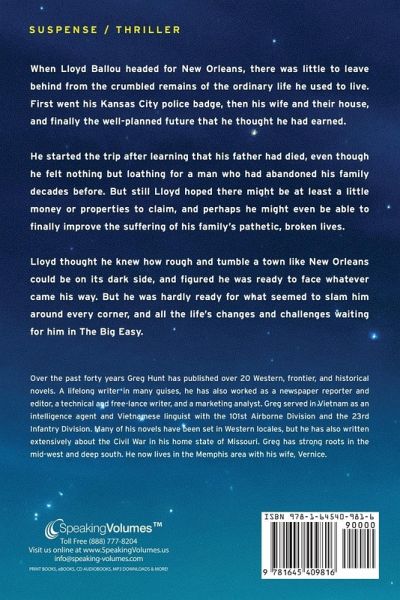 When Lloyd Ballou headed for New Orleans, there was little to leave behind from the crumbled remains of the ordinary life he used to live. First went his Kansas City police badge, then his wife and their house, and finally the well-planned future that he thought he had earned. He started the trip after learning that his father had died, even though he felt nothing but loathing for a man who had abandoned his family decades before. But still Lloyd hoped there might be at least a little money or properties to claim, and perhaps he might even be able to finally improve the suffering of his family's pathetic, broken lives. Lloyd thought he knew how rough and tumble a town like New Orleans could be on its dark side, and figured he was ready to face whatever came his way. But he was hardly ready for what seemed to slam him around every corner, and all the life's changes and challenges waiting for him in The Big Easy.