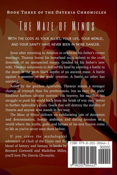 With the gods as your allies, your life, your world, and your sanity have never been in more danger. Soon after returning to Athenos to celebrate his father's recent marriage, Theseus learns his homeland must submit to the cruel demands of an unexpected enemy. Goaded by his father's new wife, Theseus volunteers to defend his land by entering a battle to the death in the pitch black depths of an ancient maze. A battle against a monster of the gods' creation. A battle no other has survived. Aided by the goddess Aphrodite, Theseus stands a stronger chance of triumph than his predecessors, but as ever, the gods' kindness harbors ulterior motives. His bravery, his sacrifice, his struggle to push his world back from the brink of war only serves to further Aphrodite's goals. Goals that will destroy the stability of Osteria and anyone who stands in her way. The Maze of Minos delivers an exhilarating tale of deception and determination, hostile ambition and daring heroism in a world where the myths, gods, and heroes of Ancient Greece come to life as you've never seen them before. If you're craving a blend of mythology, fantasy, and historical adventure, you'll love The Maze. Dare to enter The Maze of Minos by picking up your copy today!