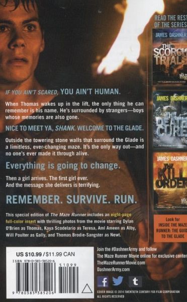 Perfect for fans of Divergent and The Hunger Games, this special movie tie-in edition of the first book in the #1 New York Times bestselling Maze Runner series, The Maze Runner, features an eight-page full-color insert with photos from the film and an exclusive fan sticker. The first three books, The Maze Runner, The Scorch Trials, and The Death Cure are all now major motion pictures featuring the star of MTV s Teen Wolf, Dylan O Brien, as Thomas; Kaya Scodelario as Teresa; Aml Ameen as Alby; Will Poulter as Gally; and Thomas Brodie-Sangster as Newt! And look for James Dashner s newest novels, The Eye of Minds and The Rule of Thoughts, the first two books in the Mortality Doctrine series.