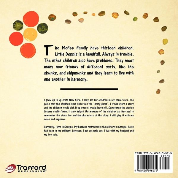 The McFee Family have thirteen children. Little Dennis is a handfull. Always in trouble. The other children also have problems. They meet many new friends of different sorts, like the skunks, and chipmunks and they learn to live with one another in harmony.