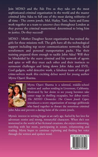 Join MDSO and the Fab Five as they take on the most sophisticated criminal organization in the world and the master criminal John Adea to foil one of the most daring robberies of all time - The crown jewels. Mel, Hailey, Tani, Aurie and Esme work together as a team to uncover clues throughout London as they pursue the criminal mastermind, determined to bring him to justice. Do they succeed ? MDSO - Mother Daughter Secret organization has trained the girls for these missions well. The girls have all the technological support including top secret communications networks, facial terraformers and personal transportation packs. Has their training prepared them enough to tackle John Adea ? Will they be blindsided by the suave criminal and his network of agents and spies or will they trust each other and their instincts to surmount challenges and bring down John Adea and EVIL. Cool gadgets, solid detective work, a fabulous team of teen girl crime-solvers mark this exciting debut novel for young author Myrra Ojasvi Sharma.