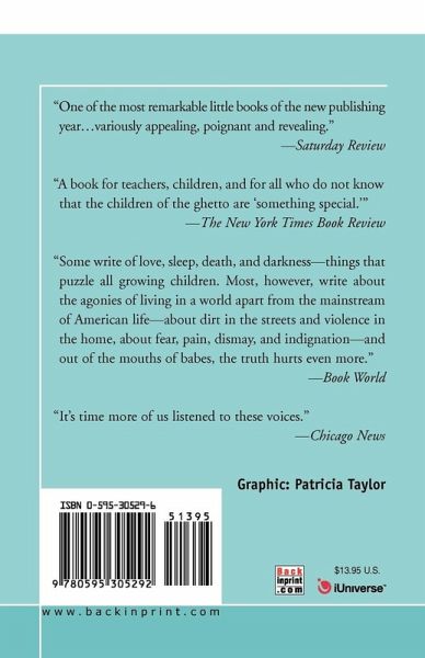 "A round my block there is a lat of glass and food and paper and people fight all the time. I like people to love each other." The ghetto child speaks, and the world emerges as he sees it and as he wishes it to be. This remarkable collection reveals the expanding awareness of nearly two hundred primary and secondary school children as they think about themselves, their painfully limiting surroundings, and the broader world which they often know of only by hearsay. Here, too, are their brightest dreams and their darkest nightmares, the things they can neither see nor touch. Though often displaying fierce emotions, these writings also express the flights of imagination which all children share. The ghetto child speaks for all of America. It is for us to listen.