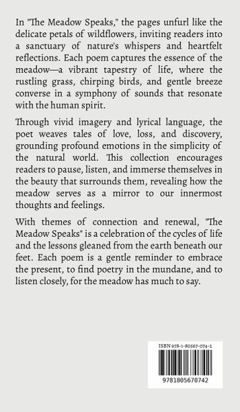 In "The Meadow Speaks," the pages unfurl like the delicate petals of wildflowers, inviting readers into a sanctuary of nature's whispers and heartfelt reflections. Each poem captures the essence of the meadow-a vibrant tapestry of life, where the rustling grass, chirping birds, and gentle breeze converse in a symphony of sounds that resonate with the human spirit. Through vivid imagery and lyrical language, the poet weaves tales of love, loss, and discovery, grounding profound emotions in the simplicity of the natural world. This collection encourages readers to pause, listen, and immerse themselves in the beauty that surrounds them, revealing how the meadow serves as a mirror to our innermost thoughts and feelings. With themes of connection and renewal, "The Meadow Speaks" is a celebration of the cycles of life and the lessons gleaned from the earth beneath our feet. Each poem is a gentle reminder to embrace the present, to find poetry in the mundane, and to listen closely, for the meadow has much to say.