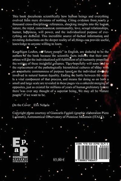 This book documents scientifically how human beings and everything evolved from mere divisions of nothing. Citing evidence from nearly a thousand cross-disciplinary references, shocking insights into the human nature, mind, consciousness, communality, love, sexual relationships, humor, happiness, will power, and the individualized purpose of everything are deduced. This incredible source of factual information and revealing deductions on the deeper reality of all things can provide useful knowledge to anyone willing to learn. Kuenftigen Leuten or "future people" in English, are deduced to be the authors of the book because the scientific facts indicate that their conscious will for the individualized self-fulfillment of all humanity propelled the writing of these insightful volumes. They hopefully will soon lead to the replacement of the pathologically hierarchical cultures of today with an empathetic commonness of purpose based on the individual diversity involved in natural human equality. Ending the battle between the sexes is a vital component of that process, and means for doing so on both a small and large scale are revealed in these pages via a coherent merging of opposites, just as existed for millions of years of human prehistory before there was ever any thought of a superior being. We may all be "future people" if we want to be.