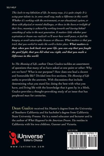 This leads to my definition of life. In many ways, it is quite simple: It is using your talents to, in some small way, make a difference in this world. Whether it's working with the environment, or our educational system, or those with physical or mental challenges, or those in the dawn or twilight of their lives, meaning is achieved by working towards and leaving behind something of value to the next generation. It matters little whether your aspiration or dream was realized: we'll never have world peace, or feed the hungry, or avoid catastrophic diseases or illnesses. What matters is that you tried, that you worked to make the world a better place. What matters is that, when you look back over your life, you can say that you fought the good fight, that you did what was right, and that you made a difference in this world. In The Meaning of Life, author Dean Gualco tackles an assortment of questions that many of us have asked at one point or other: Why are we here? What is our purpose? How does one lead a decent and honorable life? Divided into five sections, The Meaning of Life seeks to provide the answers. With discussions that include determining what you stand for, doing the best with what you have, and living life with the knowledge that it goes by in a blink, Gualco provides a thought-provoking study of an issue that has perplexed man for centuries.