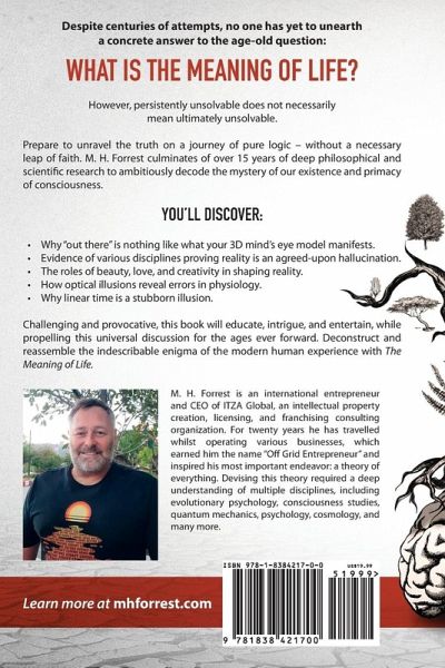 Despite centuries of attempts, no one has yet to unearth a concrete answer to the age-old question: what is the meaning of life? However, persistently unsolvable does not necessarily mean ultimately unsolvable. Prepare to unravel the truth behind our primacy of consciousness on a journey of pure logic - without a necessary leap of faith or spiritual awakening. In The Meaning of Life, M. H. Forrest culminates of over 15 years of deep philosophical theory and critical scientific research to challenge conventional wisdom and ambitiously decode the mystery of our living existence. With a refreshing new perspective, this pedagogical guide dissects the full spectrum of mind-body-spirit and provides a theory of everything that will inspire debate, enlightenment, and transformation. You'll discover:Why "out there" is nothing like what your 3D mind's eye model tricks you to believe. Evidence spanning science, philosophy, mathematics, and spirituality to prove reality is an agreed-upon hallucination. The roles that beauty, love, and creativity play to help shape reality. The power of optical illusions to reveal errors in physiology and decipher the purpose and mechanics of consciousness. Why linear time is a stubborn illusion that obscures the true self. Challenging and provocative, this book will educate, intrigue, and entertain, while propelling this universal discussion for the ages ever forward. Deconstruct and reassemble the indescribable enigma of the modern human experience with The Meaning of Life.