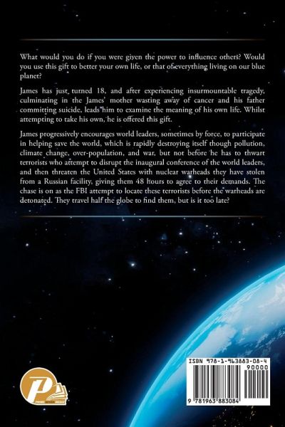 What would you do if you were given the power to influence others? Would you use this gift to better your own life, or that of everything living on our blue planet? James has just turned 18, and after experiencing insurmountable tragedy, culminating in the James' mother wasting away of cancer and his father committing suicide, leads him to examine the meaning of his own life. Whilst attempting to take his own, he is offered this gift. James progressively encourages world leaders, sometimes by force, to participate in helping save the world, which is rapidly destroying itself though pollution, climate change, over-population, and war, but not before he has to thwart terrorists who attempt to disrupt the inaugural conference of the world leaders, and then threaten the United States with nuclear warheads they have stolen from a Russian facility, giving them 48 hours to agree to their demands. The chase is on as the FBI attempt to locate these terrorists before the warheads are detonated. They travel half the globe to find them, but is it too late?