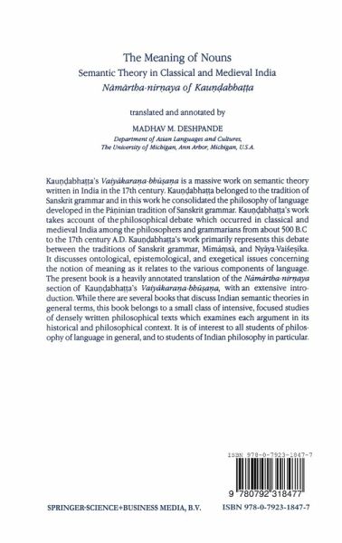 Kaun&ddotu;abhatta's Vaiyakarana-bhusana is a massive work on semantic theory written in India in the 17th century. Kaun&ddotu;abhatta belonged to the tradition of Sanskrit grammar and in this work he consolidated the philosophy of language developed in the Paninian tradition of Sanskrit grammar. Kaun&ddotu;abhatta's work takes account of the philosophical debate which occurred in classical and medieval India among the philosophers and grammarians from about 500 B.C. to the 17th century A.D. Kaun&ddotu;abhatta's work primarily represents this debate between the traditions of Sanskrit grammar, Mi&mdotu;amsa, and Nyaya-Vaisesika. It discusses ontological, epistemological, and exegetical issues concerning the notion of meaning as it relates to the various components of language. The present book is a heavily annotated translation of the Namartha-nirnaya section of Kaun&ddotu;abhatta's Vaiyakarana-bhusana, with an extensive introduction. While there are several books that discuss Indian semantic theories in general terms, this book belongs to a small class of intensive, focused studies of densely written philosophical texts which examines each argument in its historical and philosophical context. It is of interest to all students of philosophy of language in general, and to students of Indian philosophy in particular.