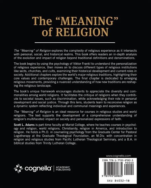 The "Meaning" of Religion explores the complexity of religious experience as it intersects with personal, social, and historical realms. This book offers readers an in-depth analysis of the evolution and impact of religion beyond traditional definitions and denominations. The book begins by using the psychology of Viktor Frankl to understand the personalization of religious experience, then moves on to discuss different types of religious institutions like sects, churches, and cults, examining their historical development and current roles in society. Additional chapters explore the world's major religious traditions, highlighting their core values and contemporary challenges. The final chapter is dedicated to emerging religious movements, providing a nuanced understanding of how new traditions are reshaping the religious landscape. The book's unique framework encourages students to appreciate the diversity and commonalities among world religions. It facilitates the critique of religions when they contribute to societal issues, such as discrimination, while acknowledging their role in personal development and social justice. Through this lens, students learn to reconceive religion as a dynamic system reflecting individual and communal meanings and experiences. The "Meaning" of Religion is an ideal resource for courses in religious studies and world religions. The text supports the development of a comprehensive understanding of religion's multifaceted impact on society and personalized expressions of faith.
