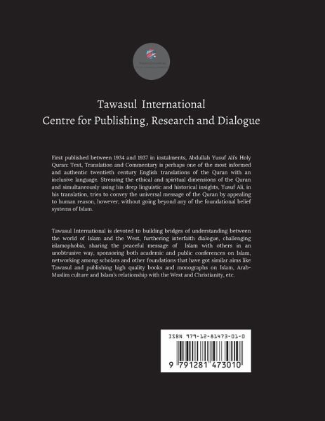 First published between 1934 and 1937 in instalments, Abdullah Yusuf Ali's Holy Quran: Text, Translation and Commentary is perhaps one of the most informed and authentic twentieth century English translations of the Quran with an inclusive language. Stressing the ethical and spiritual dimensions of the Quran and simultaneously using his deep linguistic and historical insights, Yusuf Ali, in his translation, tries to convey the universal message of the Quran by appealing to human reason, however, without going beyond any of the foundational belief systems of Islam. Tawasul International is devoted to building bridges of understanding between the world of Islam and the West, furthering interfaith dialogue, challenging islamophobia, sharing the peaceful message of Islam with others in an unobtrusive way, sponsoring both academic and public conferences on Islam, networking among scholars and other foundations that have got similar aims like Tawasul and publishing high quality books and monographs on Islam, Arab-Muslim culture and Islam's relationship with the West and Christianity, etc.